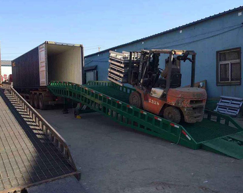三、進行登車作業(yè)前,應(yīng)先檢查登車橋各部位有無異常。再將登車橋置于空闊、安全的場所,和相應(yīng)需裝卸的貨柜、車進行安全對接好以后,在貨車車輪下方墊好安全三角木。