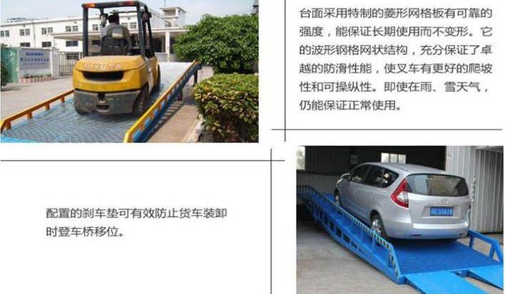 移動(dòng)式液登車橋是與叉車配合使用的貨物裝卸輔助設(shè)備。移動(dòng)式液登車橋是與叉車配合使用的貨物裝卸輔助設(shè)備。采用人工液壓動(dòng)力,勿須外接動(dòng)力電源即可輕松實(shí)現(xiàn)登車橋的高度調(diào)節(jié)??烧{(diào)節(jié)長(zhǎng)度的索鏈用于鉤住車輛,使登車橋與車輛即使發(fā)生移位時(shí),始終緊密貼合。移動(dòng)輪采用實(shí)心輪胎,不用充氣,堅(jiān)固,配合剎車墊,保證作業(yè)安全。